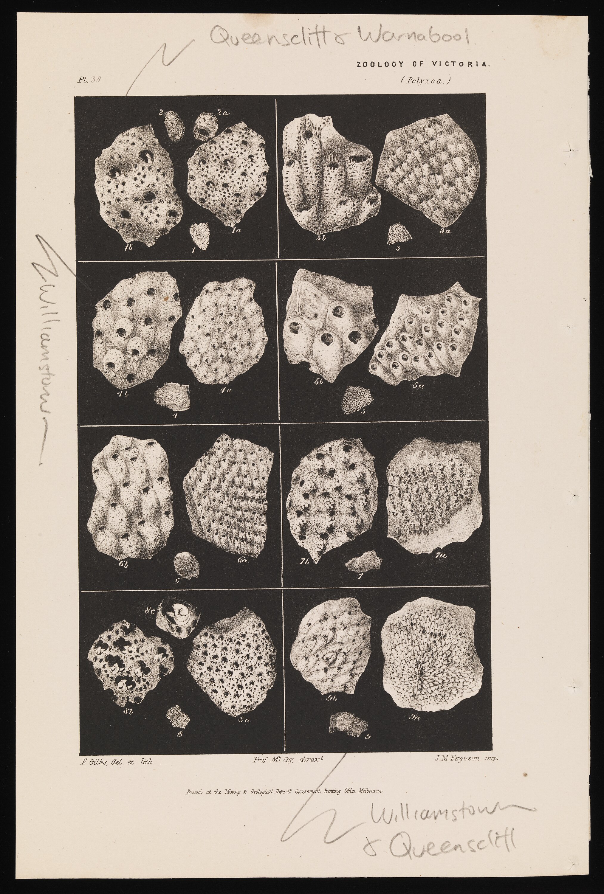 Published as Plate 38 in The Prodromus of the Zoology of Victoria by Frederick McCoy. Handwritten pencil location notes added post-publication (probably quite recent)