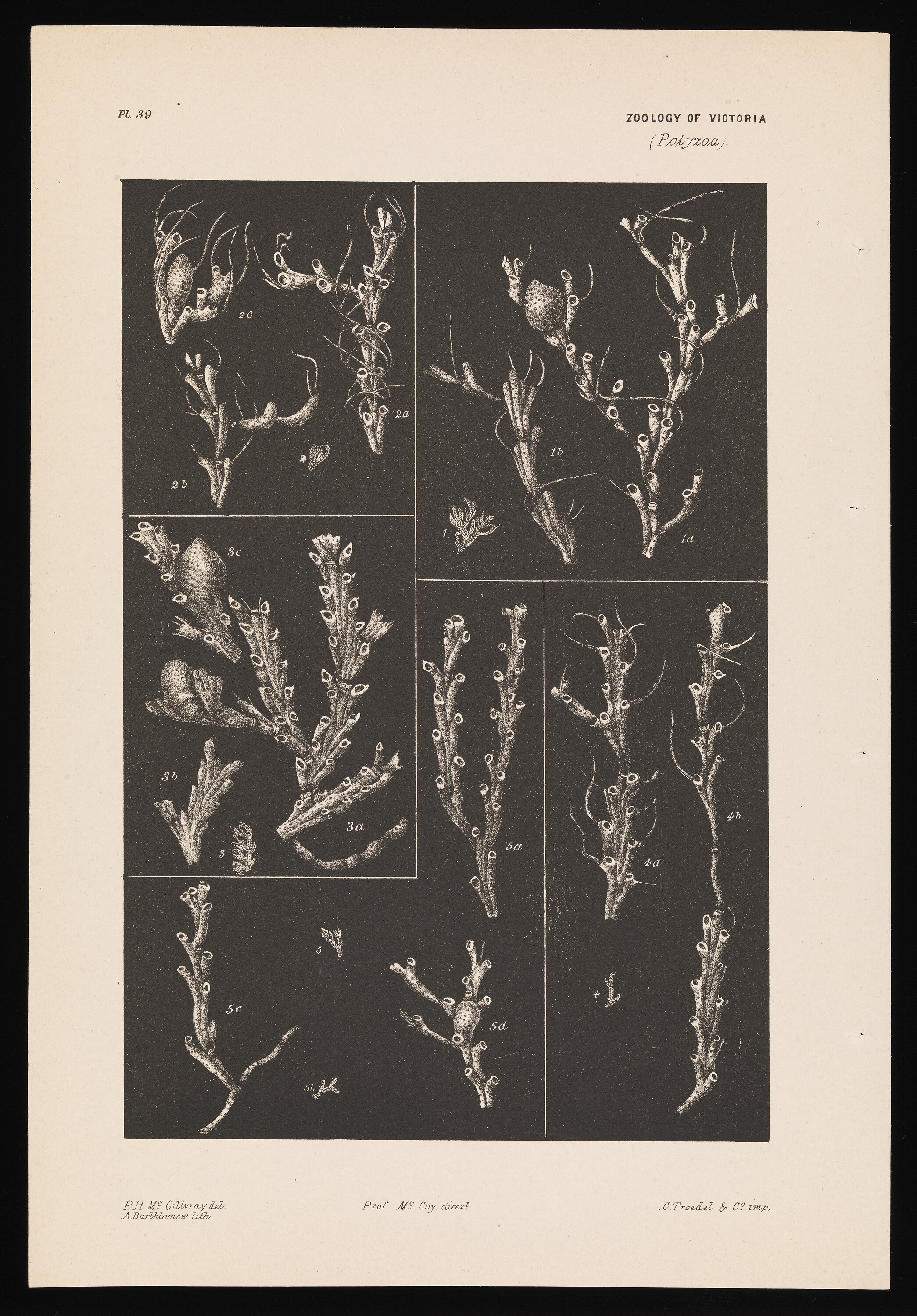 Lithographic print of five bryozoan species by P.H. McGillivray. This work was commissioned by Frederick McCoy, the first Director of The National Museum of Victoria, for Plate 1 in The Prodromus of the Zoology of Victoria; Figures and descriptions of the living species of all classes of the Victoria indigenous animals.