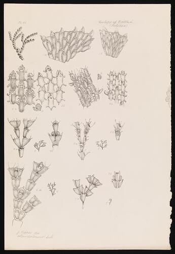Series of Bryozoan illustrations finally published as Plate 46 in The Prodromus of the Zoology of Victoria by Frederick McCoy.