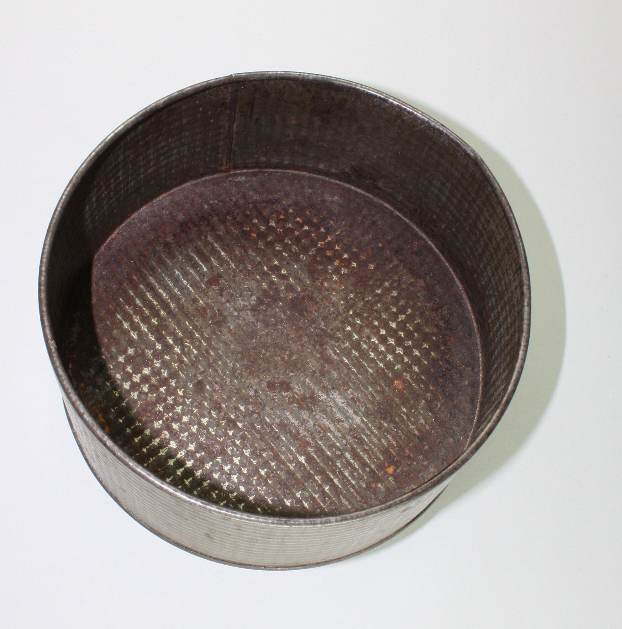 Round tin used for baking cakes. Lucy was a keen baker and cook and won many prizes in the Ballarat Show for her mince pies and Christmas puddings. Her traditional Christmas dinners were elaborate affairs as the family settled and became more affluent and even in her later years her enormous turkeys contained two types of stuffing and she continued to make her dark, rich Christmas puddings.