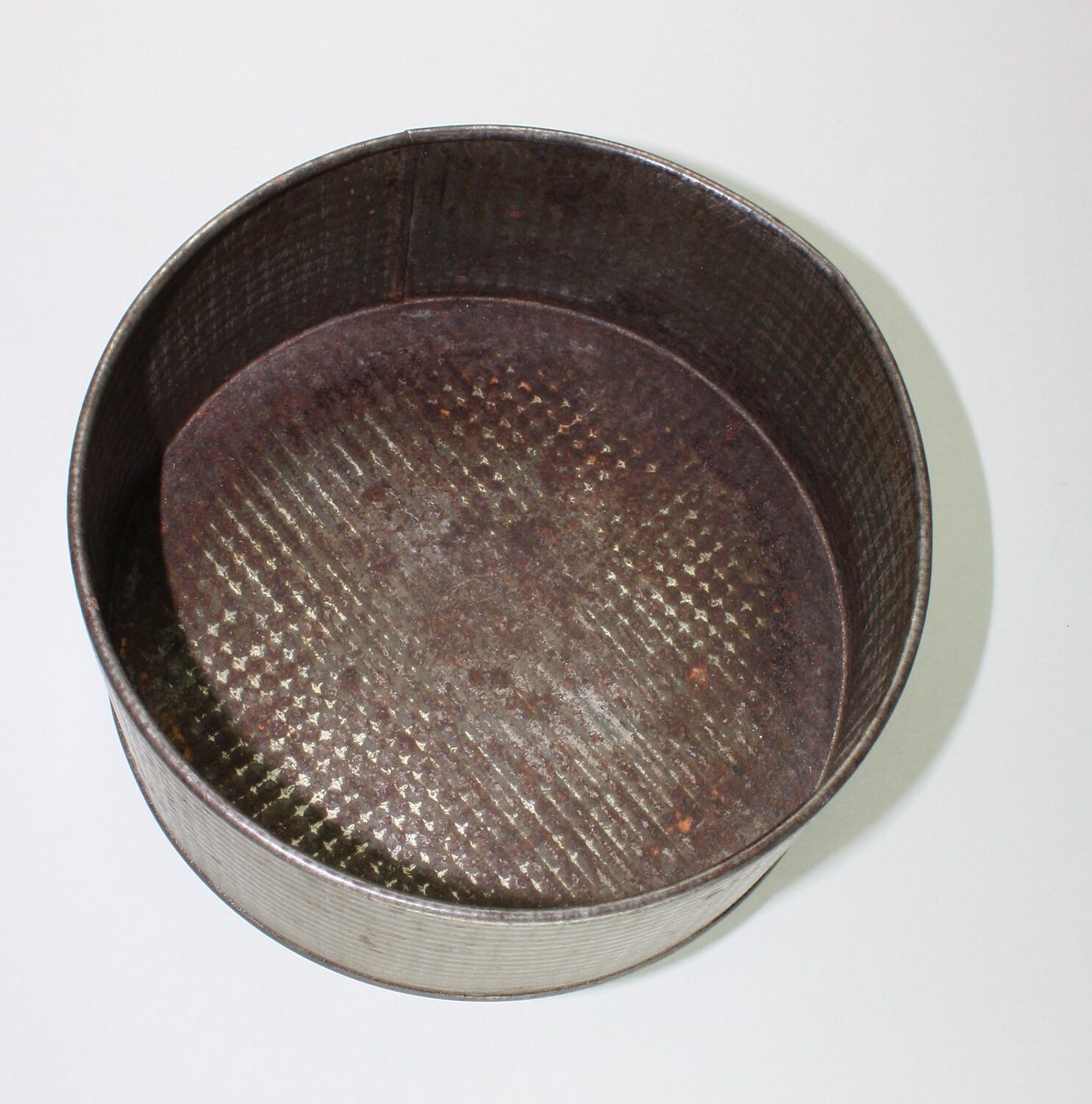Round metal cake tin with a stippled finish and a trademark imprinted on underside of base.