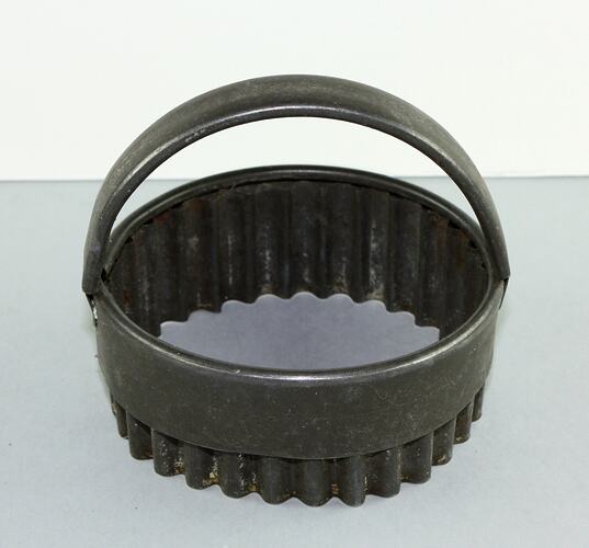 Pastry cutter, round with handle and serrated edge. One of a set of nine in various sizes, with serrated and smooth edges, and with and without handles. The cutters were particularly used by the owner for making Christmas mince tarts. It was one of a number of cooking items brought to Australia by Lucy Hathaway when she migrated from England in 1951. Lucy was a keen baker and cook and won many prizes in the Ballarat Show for her mince pies and Christmas puddings. Her traditional Christmas dinners were elaborate affairs as the family settled and became more affluent and even in her later years her enormous turkeys contained two types of stuffing and she continued to make her dark, rich Christmas puddings.