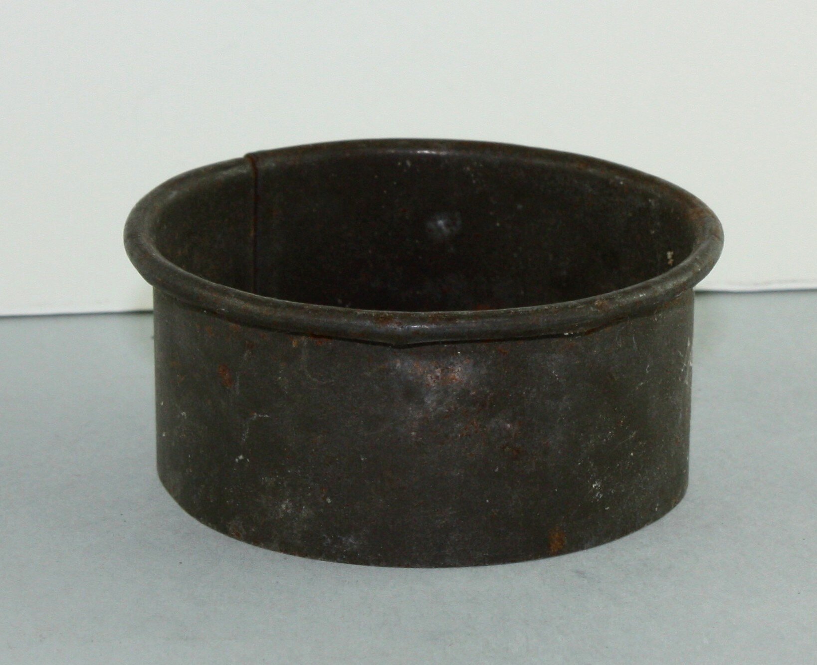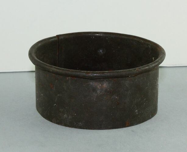 Small round tin pastry cutter, welded close at one side. Smooth edges, top edge rounded over.