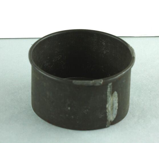 Small round tin pastry cutter, welded close at one side. Smooth edges, top edge rounded over.