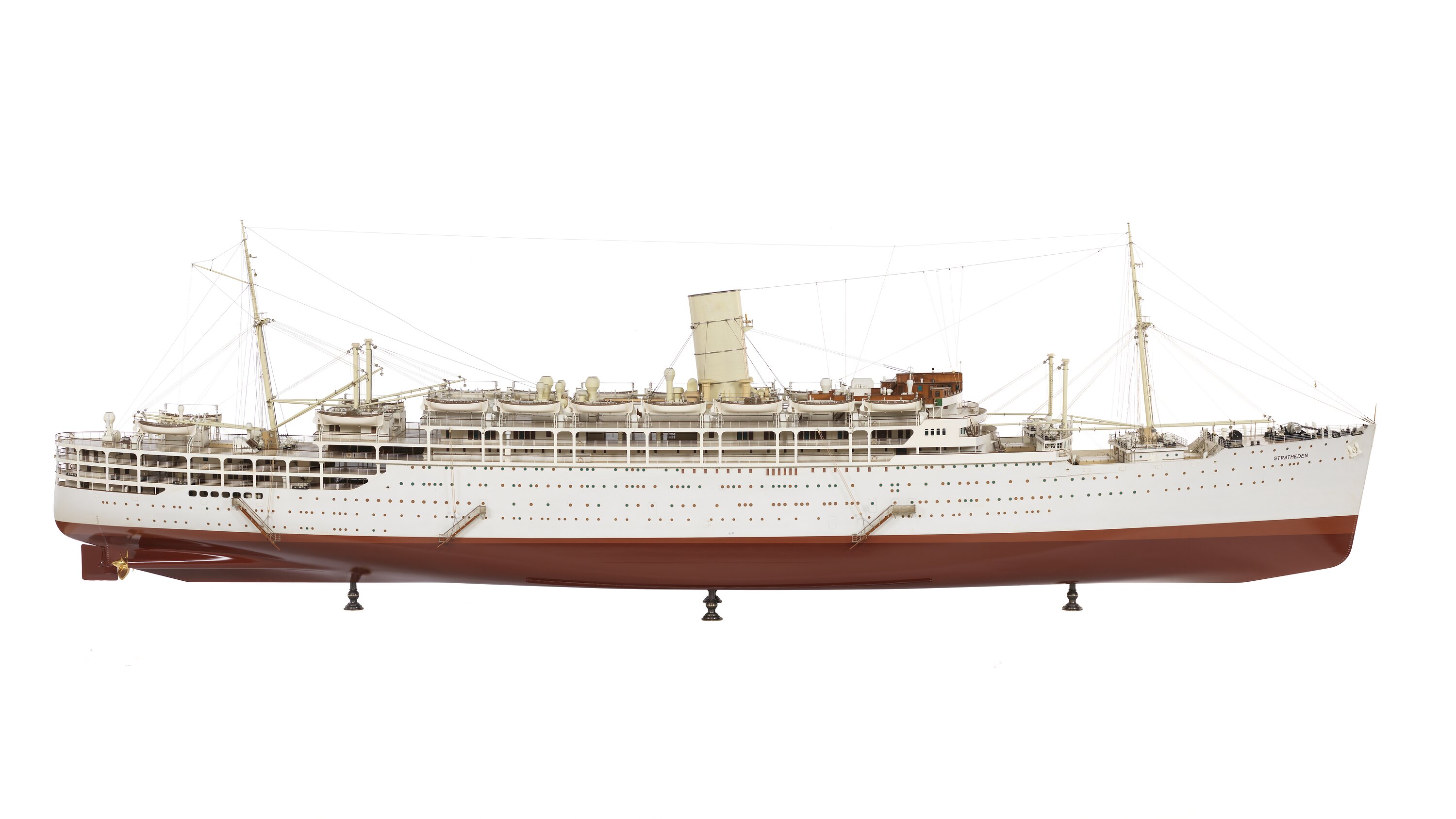 Shipbuilder' s scale model of the P&O Line's Royal Mail, passenger & cargo liner S.S. 'Stratheden', mounted in original glass and wooden display case. The model scale appears to be 1:54 or 1-inch to 4½ feet.