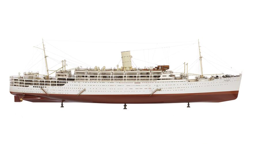 Solid wooden-hulled ship model with laminated planked decking and miniaturised metal, wood and glass fittings and full deck furnishings and rigging. There appears to have been no plastics used in the model's construction. The model is mounted in its original oak-framed display case with shout turned legs and glazing all-round on four sides and overhead. Model length 4.1 metres (148-in) x width 0.8 metres (16-in) x height 2.2 metres (42-in) (including original display case) The height of the plinth is about 0.9 metres (36-in) above floor level The dimensions of the original ship were: Length overall 664 ft 6 in (202.54 m) Breath moulded 82 ft 0 in (24.99 m) Depth to 'C' deck 63 ft 6 in (19.35 m) Draught 30 ft (9.1 m) Model scale appears to be 1:54 or 1 inch to 4½ feet.