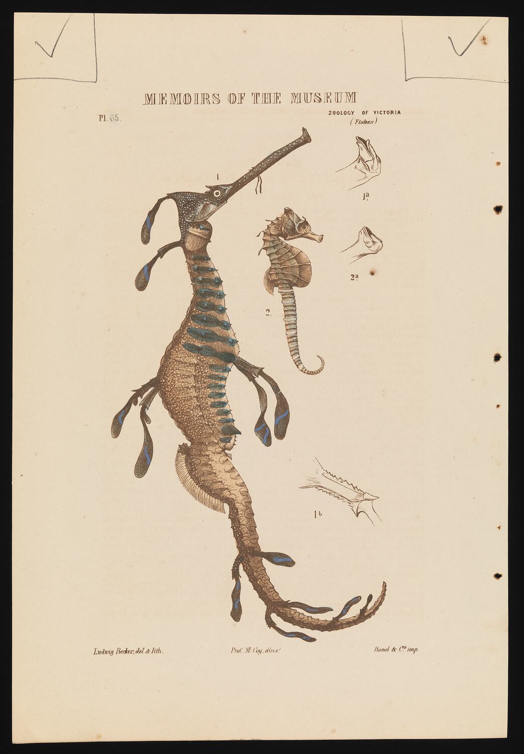 Lithographic colour print, Plate 65, of a Common Seadragon, Phyllopteryx taeniolatus, and a Shorthead Seahorse, Hippocampus breviceps, by Ludwig Becker, in the Prodromus of the Zoology of Victoria by Frederick McCoy.