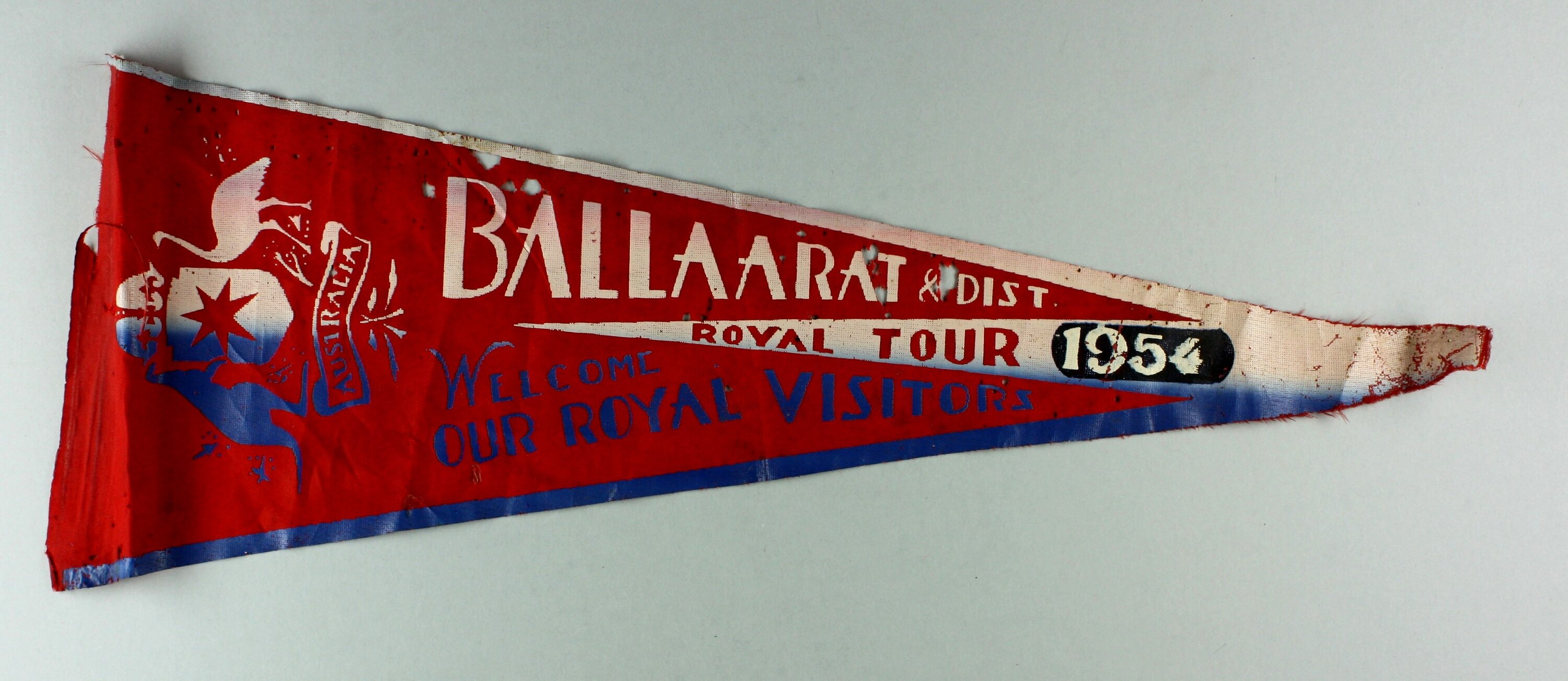 Souvenir pennant commemorating the Royal Visit of Queen Elizabeth II in 1954. It was acquired at the time of the celebrations in Ballarat by Lucy Hathaway who had migrated to Australia from England in 1951. Lucy maintained her interest in and loyalty to England and the Royal Family during her lifetime.