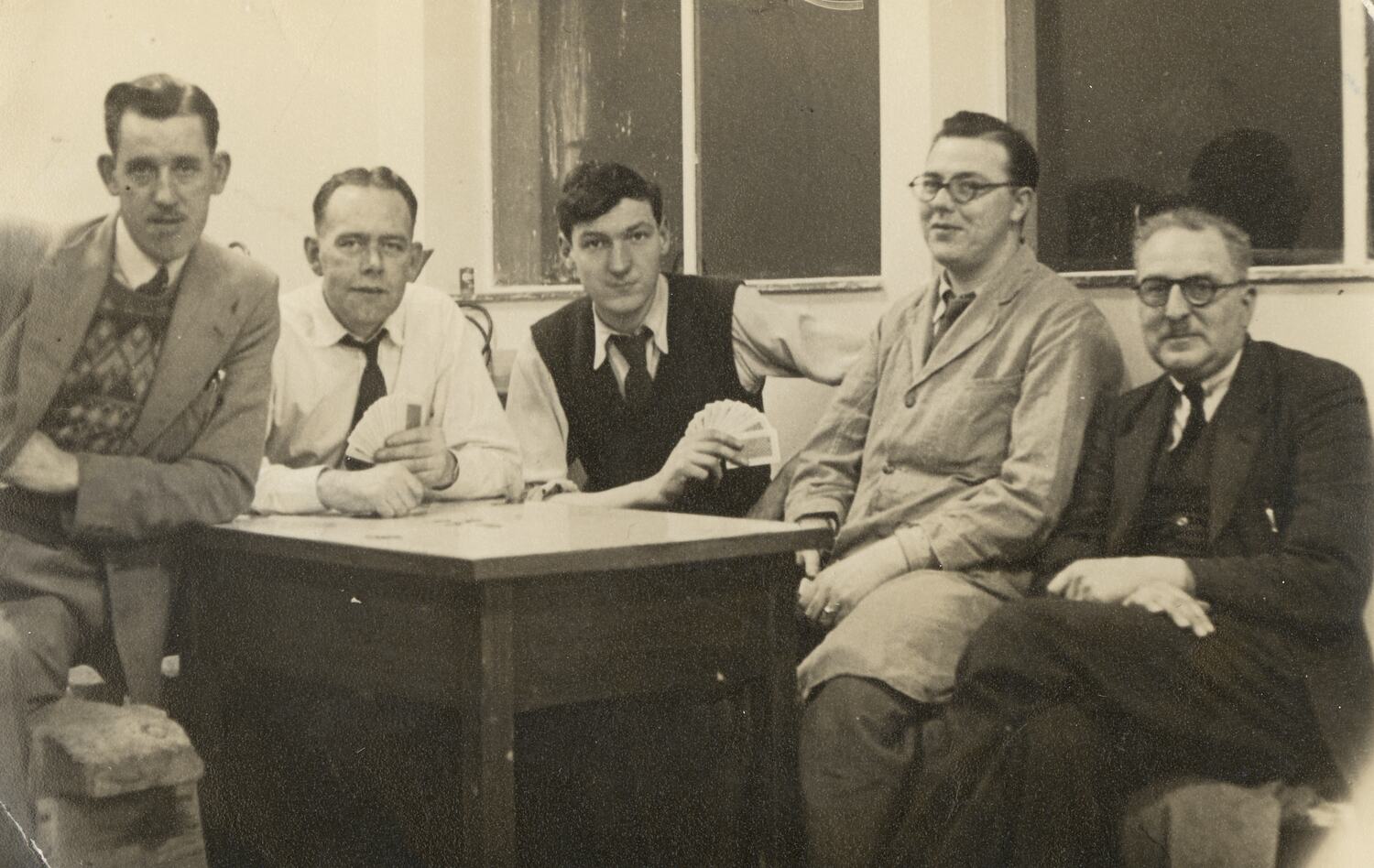 Digital photograph of James William Ward (second from right) with four workmates at I.C.I. Works, Wilton, Yorkshire, England, circa 1950. One of 84 digital photographs relating to the Ward family migration experience including their life in England, their voyage in 1961 to Australia and their settlement in Melbourne.