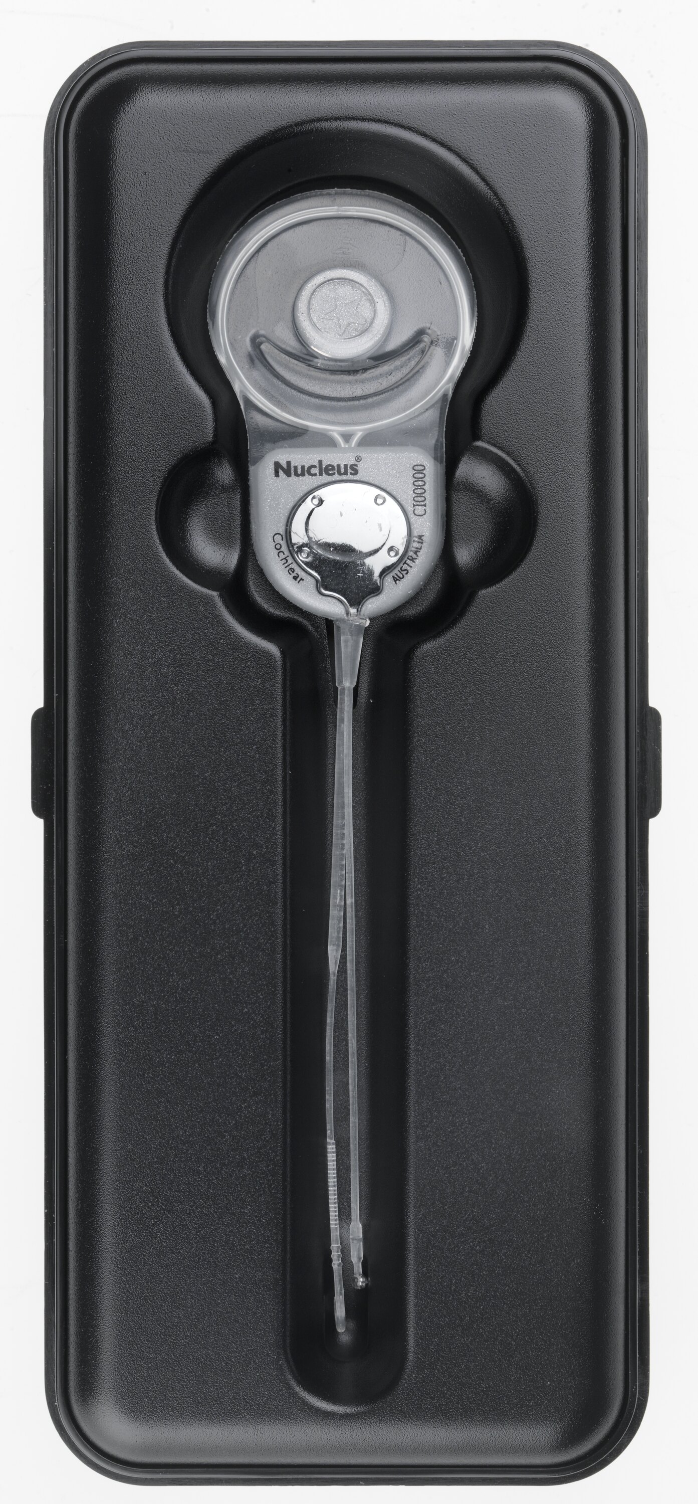 Plastic and titanium implant with circular end narrowing to two short cords. One cord is a Contour Advance Electrode and is tightly curled at the end; the other is a Straight Electrode. Incased inside a plastic case for display purposes with a black plastic base.