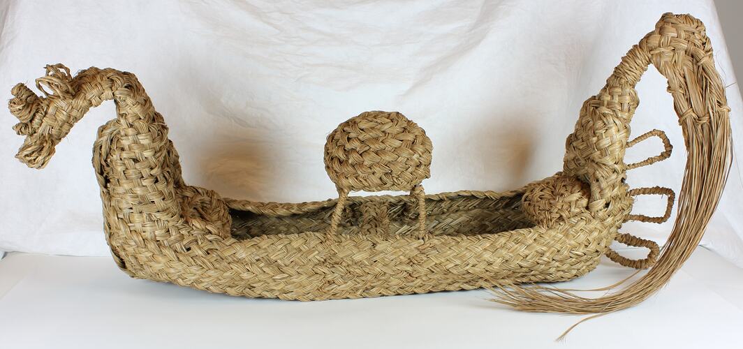 Item woven in the shape of a gondola with hooded piece at centre, draped reeds at stern and hooked piece at bow.