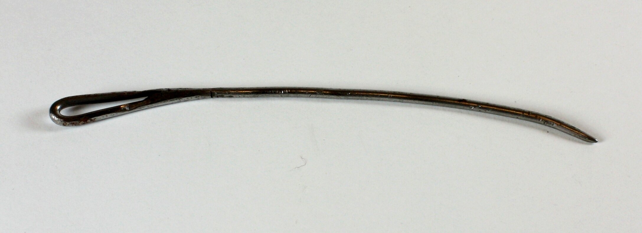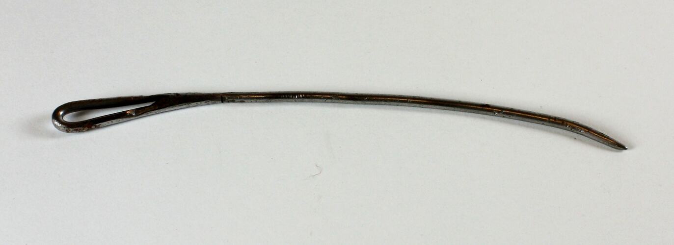 Metal needle with slight curve and an eye at one end.