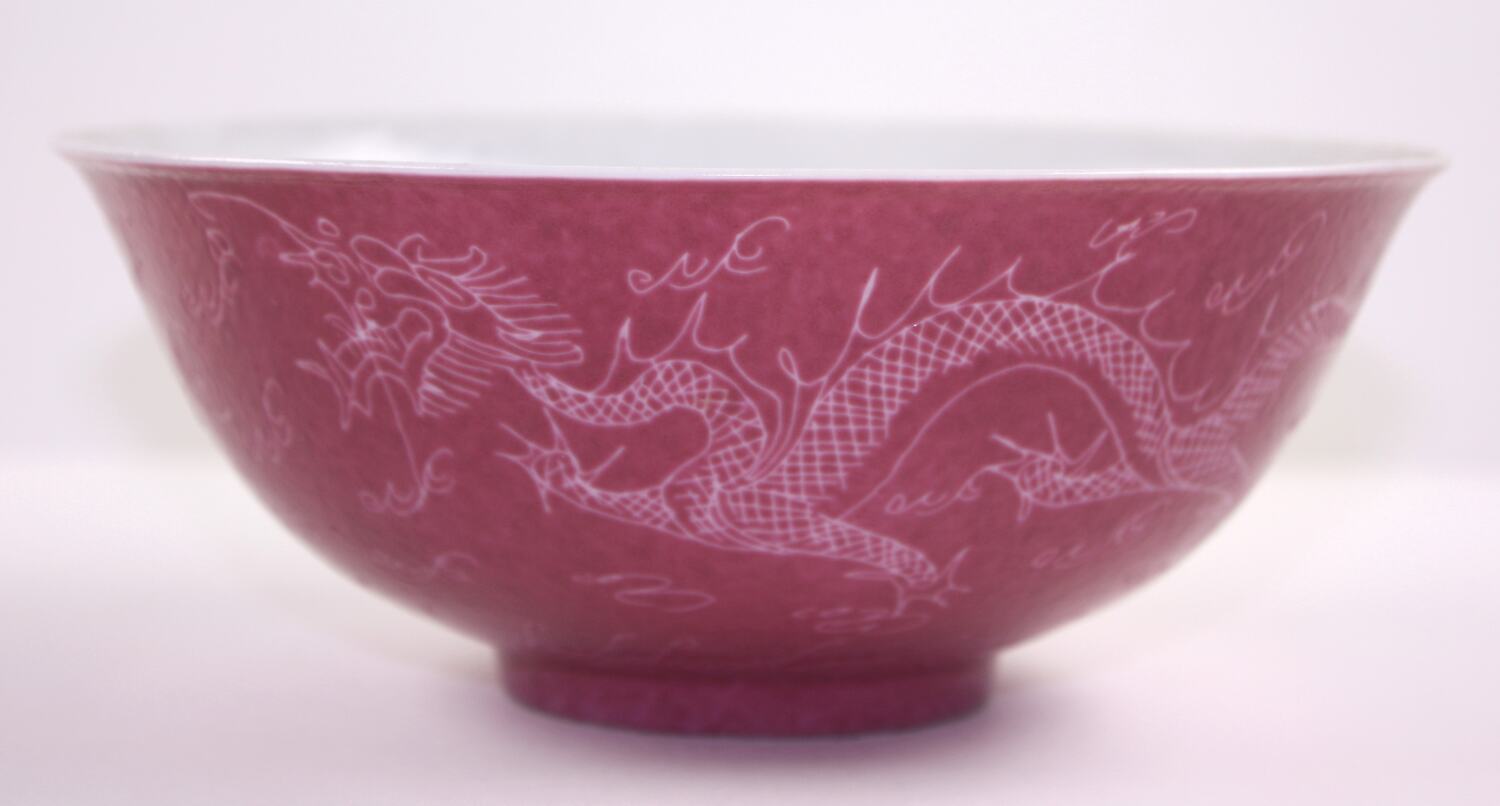 Porcelain bowl 163 millimeters in diameter. Plain white on the inside and pink on the outside with a dragon pattern. The underside of the bowl has Chinese characters on it.