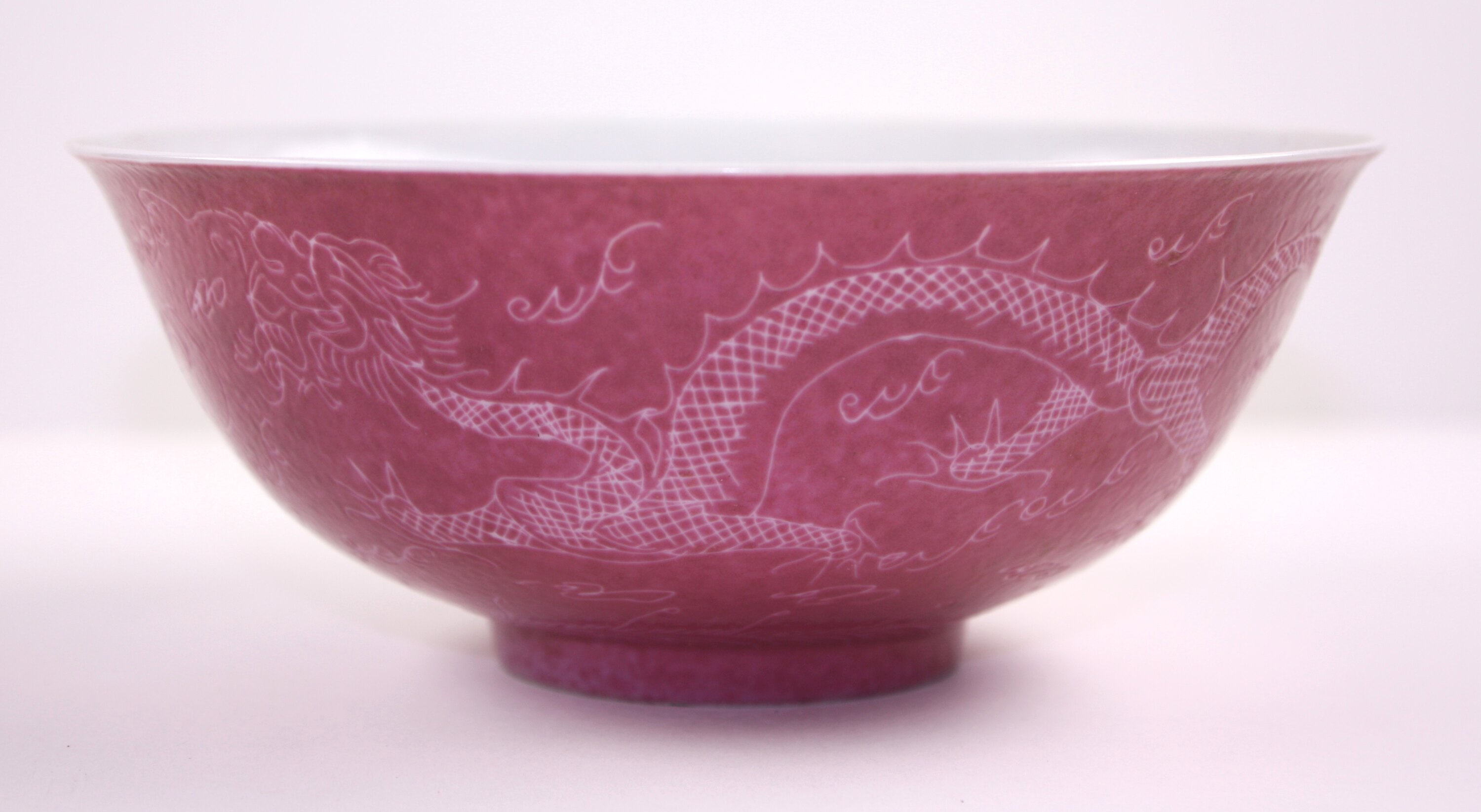 Porcelain bowl 163 millimeters in diameter. Plain white on the inside and pink on the outside with a dragon pattern. The underside of the bowl has Chinese characters on it.