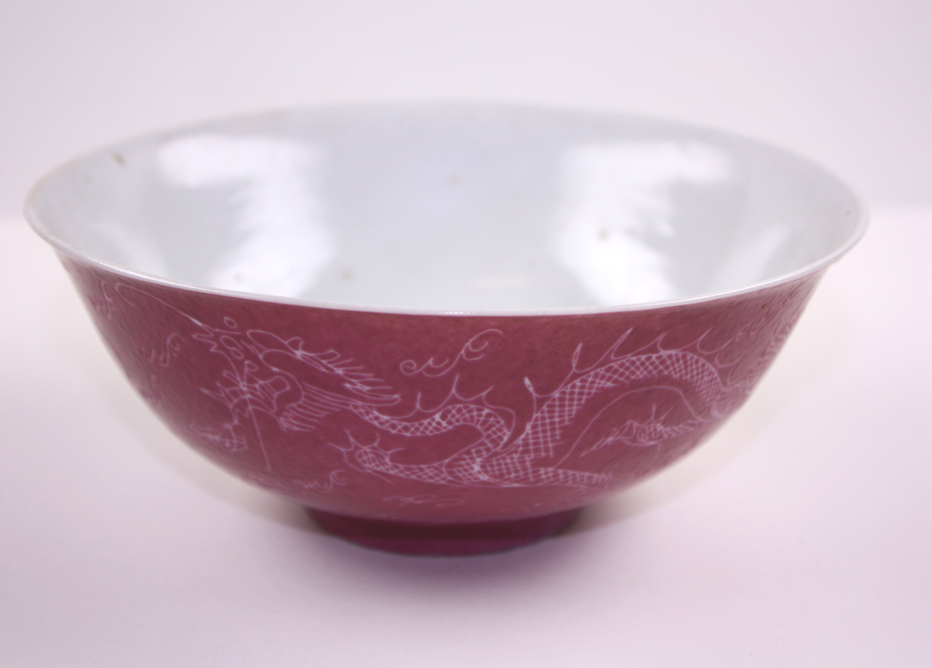Porcelain bowl 163 millimeters in diameter. Plain white on the inside and pink on the outside with a dragon pattern. The underside of the bowl has Chinese characters on it.