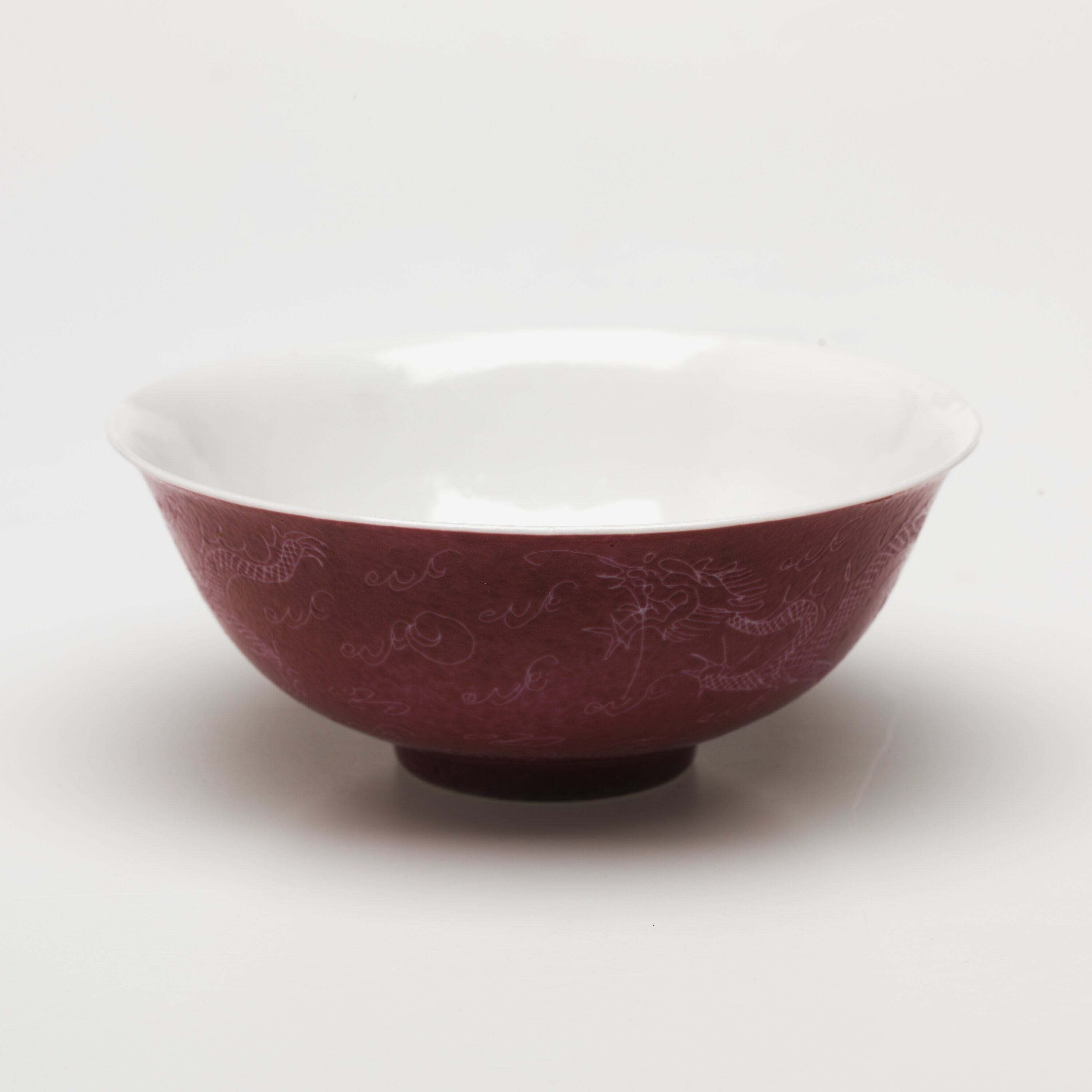 Porcelain bowl 163 millimeters in diameter. Plain white on the inside and pink on the outside with a dragon pattern. The underside of the bowl has Chinese characters on it.