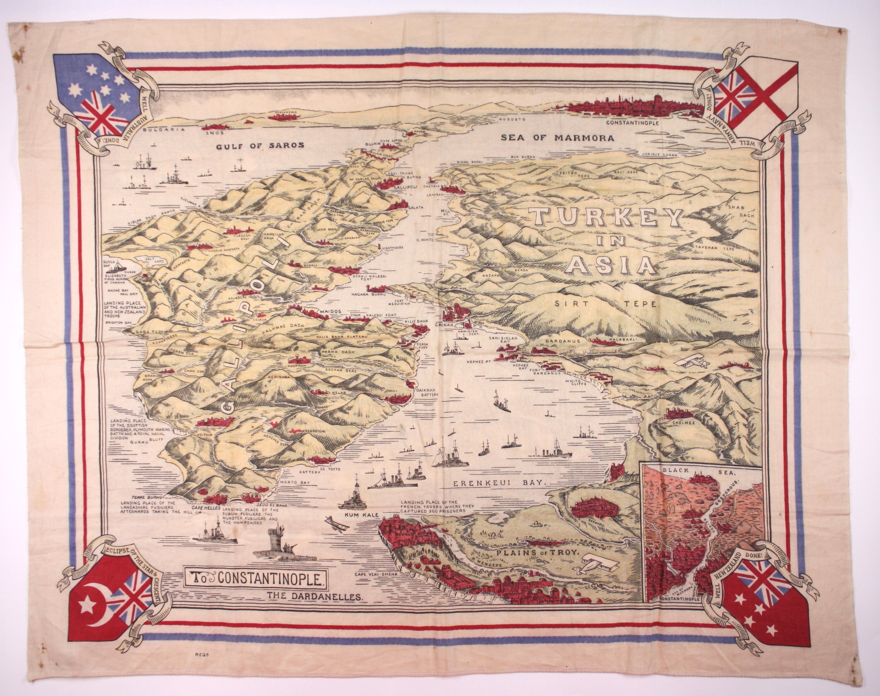 Cloth scarf printed in full colour. Depicts the landscape in the region of the Gallipoli peninsula, presented in relief. Urban areas are coloured red, including Constantinople. Significant towns and the landing places of the different Allied units are marked. Each corner of the map has an Allied nation flag in shield shape.