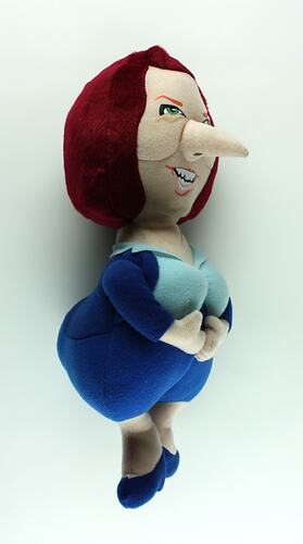 Soft textile figure of Julia Gillard wearing blue suit and blue high heels with large head, bright red hair, long nose, large hips and protruding bottom.