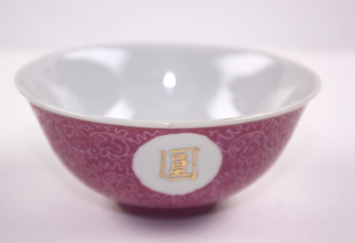 Large porcelain sauce dish. The inner side of the bowl is pink with gold Chinese characters in white circles, The outside is white.