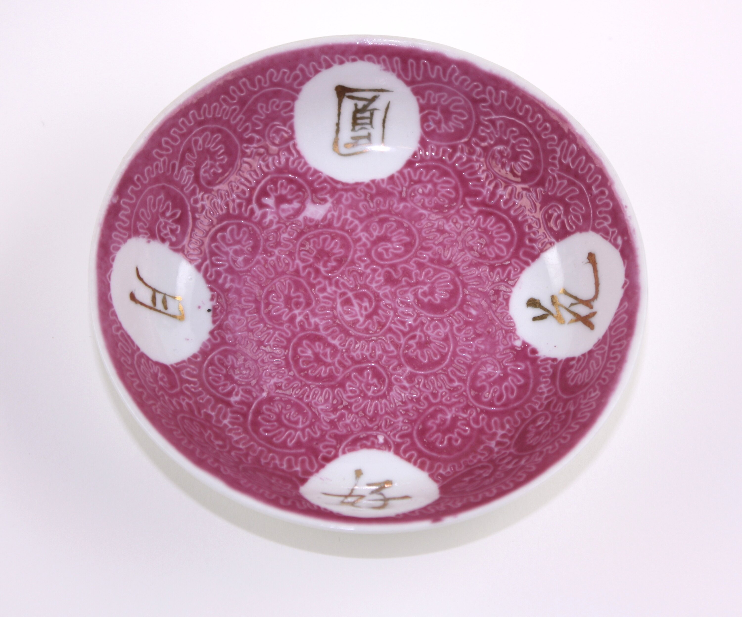 Large porcelain sauce dish. The inner side of the bowl is pink with gold Chinese characters in white circles, The outside is white.
