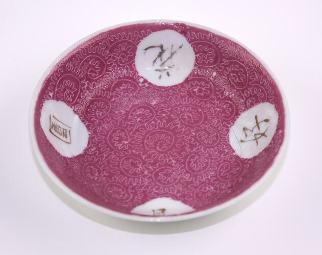 Large porcelain sauce dish. The inner side of the bowl is pink with gold Chinese characters in white circles, The outside is white.