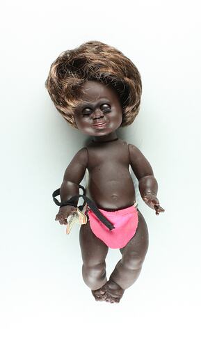 The history of racialised dolls is a complex one. At the time of the production of the Metti dolls there was a problematic and often tokenistic representation of cultures that were often used in a paternalistic way, portraying Indigenous cultures as an exotic curiosity with Metti ostensibly 'possessing' a representation of these people. This and other Metti branded dolls in the collection have another layer of complexity as they were designed with the community in Papua New Guinea with the intent to represent cultural clothing and accessories as accurately as possible. Moreover, such dolls did inject into the toy market more cultural diversity for children; whether this was in the minds of the people producing these dolls is unknown but it is more likely the motivation leant towards selling exotic curiosities.