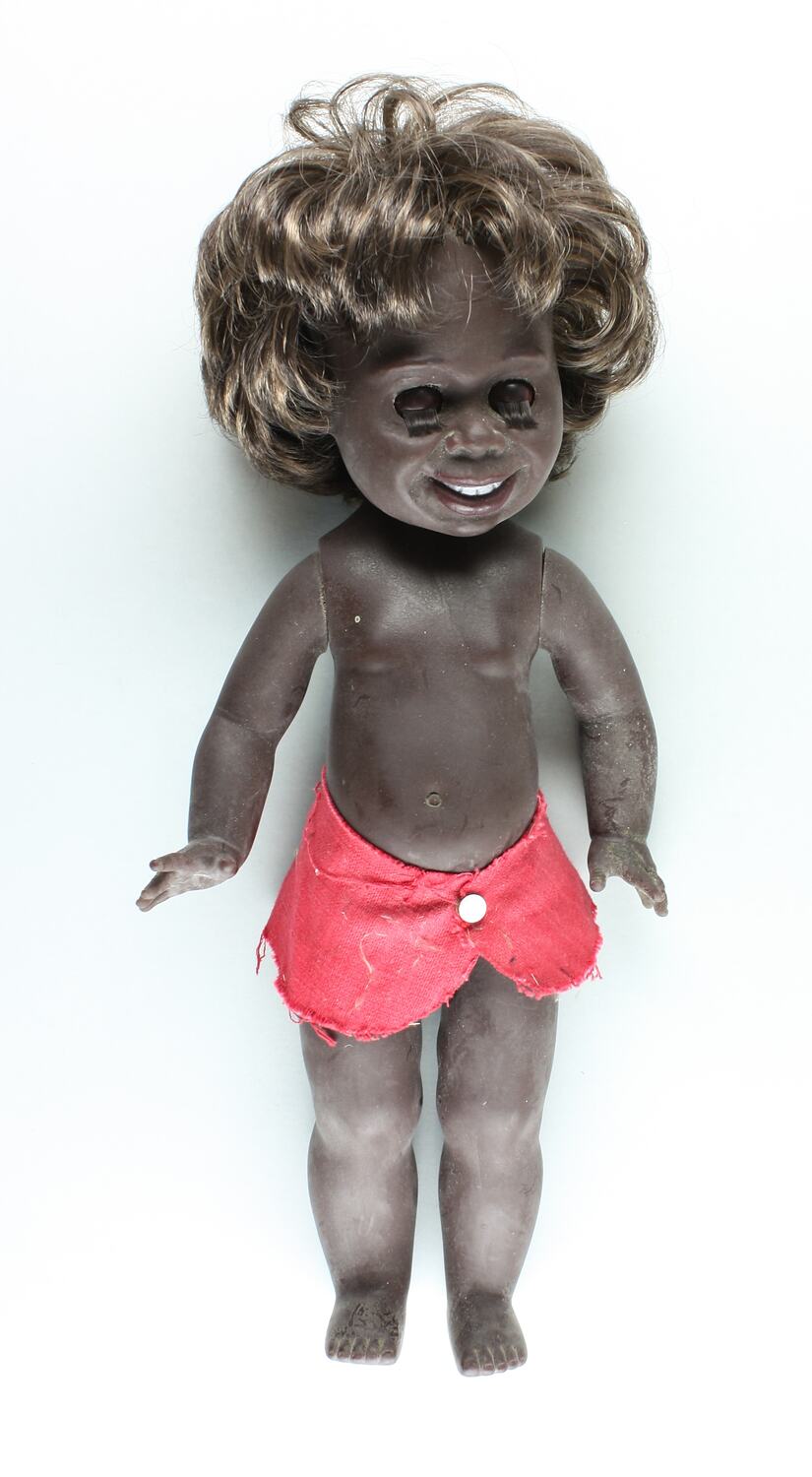 Note: terms such as 'piccaninny' are not condoned by Museums Victoria which considers them to be racist. Historical distance and context do not excuse or erase this fact. This doll is also an example cultural stereotyping for some people.
