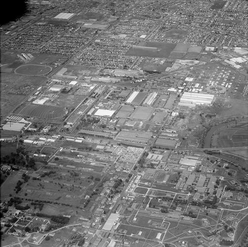 Oblique aerial photograph of the suburbs of Maidstone and Maribyrnong looking south-east from the Department of Defence grounds showing the area bounded by the Maribyrnong River, Canning Street (which turns into Cordite Avenue), Rosamond Road and Barkly Street. In the middle of the image are industrial buildings (possibly part of the Ordnance Factory). On the south side of the factory is the Maribyrnong Migrant Hostel (now Victoria University Student Village) and on the east side is Maribyrnong Sunset Drive-In.