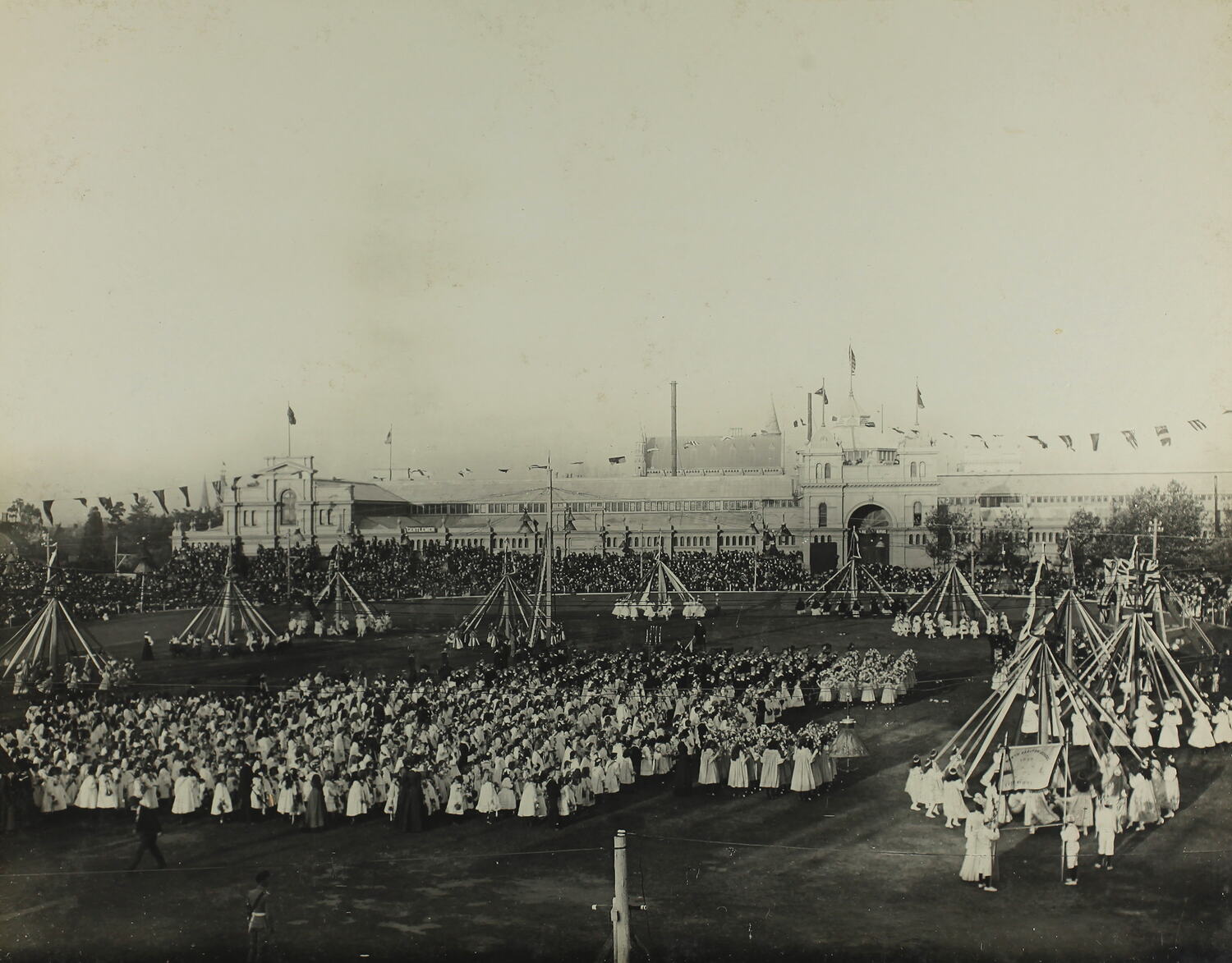 Schoolchildren performing on the grounds of the Exhibition Building, Melbourne, as part of Federation celebrations, 11th May 1901. The display includes maypole and flower dance celebrations. In the background is the Exhibition Building.