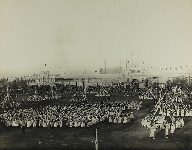 Australian Federal Parliament Opening Ceremony, 1901, Celebrations, Governments, Royal Visits, Street Decorations, Public Ceremonies, Public Events, Architecture, Royal Exhibition Building: History of Events, 1900-1949, Royal Exhibition Building, Maypoles, School Children, Folk Festivals
