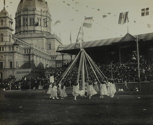 Australian Federal Parliament Opening Ceremony, 1901, Celebrations, Governments, Royal Visits, Street Decorations, Public Ceremonies, Public Events, Architecture, Royal Exhibition Building: History of Events, 1900-1949, Royal Exhibition Building, Maypoles, School Children, Folk Festivals