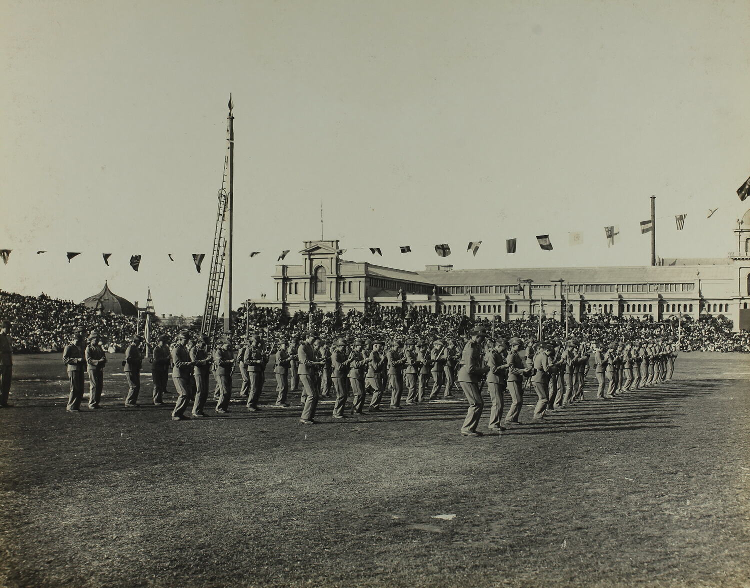 School children cadets in army uniform, performing on the grounds of the Exhibition Building, Melbourne, as part of Federation celebrations, 11th May 1901.