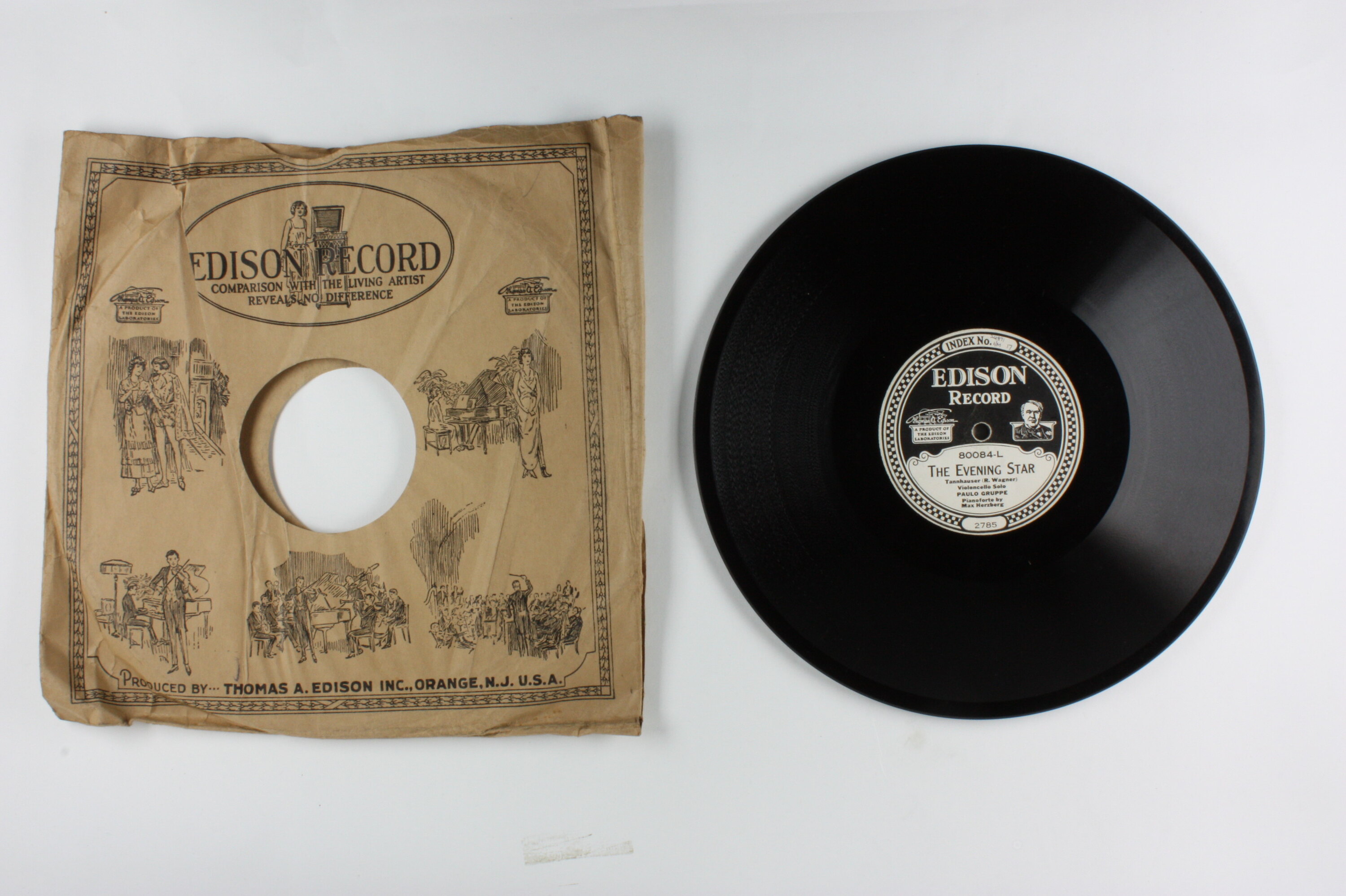 Side A: INDEX No. 24871 1/M 17 / EDISON RECORD / A PRODUCT OF EDISON LABORATORIES / 80084-L / THE EVENING STAR / Tannhauser R. Wagner) / Violincello Solo / PAULO GRUPPE/ Pianforte by / Max Herzberg / 2785 Side B: EDISON RECORD / A PRODUCT OF EDISON LABORATORIES / 80084-R / SERENADE / (Moszowski) / Violin, Violincello, Flute and Harp / VENETIAN INSTRUMENTAL / QUARTET / Made in U.S.A. / 2586 One side of sleeve: EDISON RECORD / (text and illustrations) Second side of sleeve: (text) / (Patents - list of years latest1918) / (text)