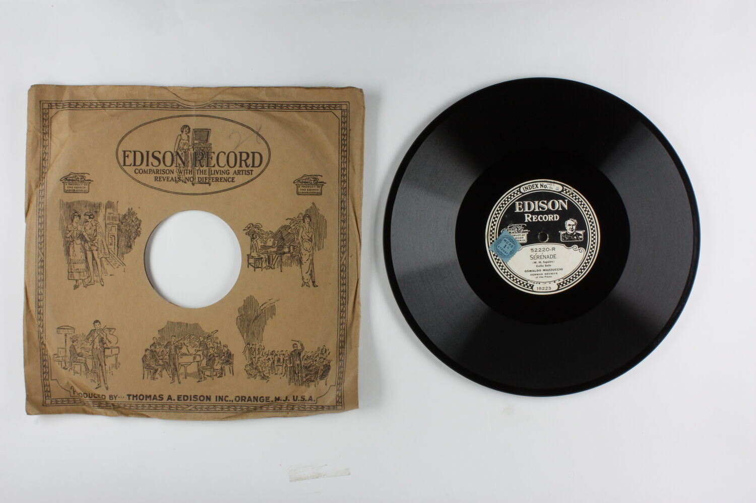 Side A: INDEX No. 24871 1/M 22 / EDISON RECORD / A PRODUCT OF EDISON LABORATORIES / 52220-R / SERENADE / (W. H. Squire) / Cello Solo / OSWALDO MAZZUCCHI / HERMAN NEUMAN / at the Piano / Made in U.S.A. / 18223 Side A has a blue square sticker: 'M.C.P.S 1 Sydney' Side B: EDISON RECORD / A PRODUCT OF EDISON LABORATORIES / 52220-L / DANZA ESPANOLA / (Granados) / Cello Solo / OSWALDO MAZZUCCHI / HERMAN NEUMAN / at the Piano / Made in U.S.A. / 18224 One side of sleeve: EDISON RECORD / (text and illustrations) Second side of sleeve: (text) / (Patents - list of years latest1918) / (text)