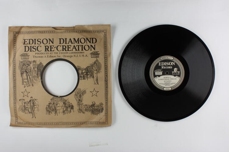 Side A: INDEX NO. 24871 1/M 24 / EDISON RECORD / A PRODUCT OF THE EDISON LABORATORIES / 80800-L / LIEBESTRAUM (DREAM OF LOVE) / (Franz Liszt) / Played by FREDERICK KINSLEY / on the Midmer-Losh / Pipe Organ / 9566 Side B: EDISON RECORD / A PRODUCT OF THE EDISON LABORATORIES / 80800-R / PRELUDE IN C SHARP MINOR OP. 3 / (Sergei Rachmaninoff) / Played by FREDERICK KINSLEY / on the Midmer-Losh / Pipe Organ / 9565 One side of sleeve: EDISON DIAMOND DISC RE-CREATION / (text and illustrations) Second side of sleeve: (text) / (Patents - list of years latest1918) / (text)