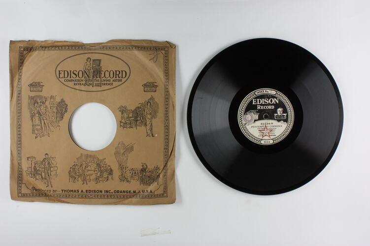 Side A: INDEX NO. 24871 V/O 27 / EDISON RECORD / A PRODUCT OF THE EDISON LABORITORIES / 82334-R / PRINTEMPS QUI COMMENCE / (Fair Spring is returning) / SAMSON ET DALILA / (Charles Saint- S?ens) / Contralto in French / KATHLEEN HOWARD / 5024 Side B: EDISON RECORD / A PRODUCT OF THE EDISON LABORITORIES / 82334-L / OU VA LA JEUNE INDOUE / (BELL SONG) / LAKME / Soprano in French / YVONNE DE TRÉVILLE / 4979 One side of sleeve: EDISON RECORD / (text and illustrations) Second side of sleeve: (text) / (Patents - list of years latest1918) / (text)