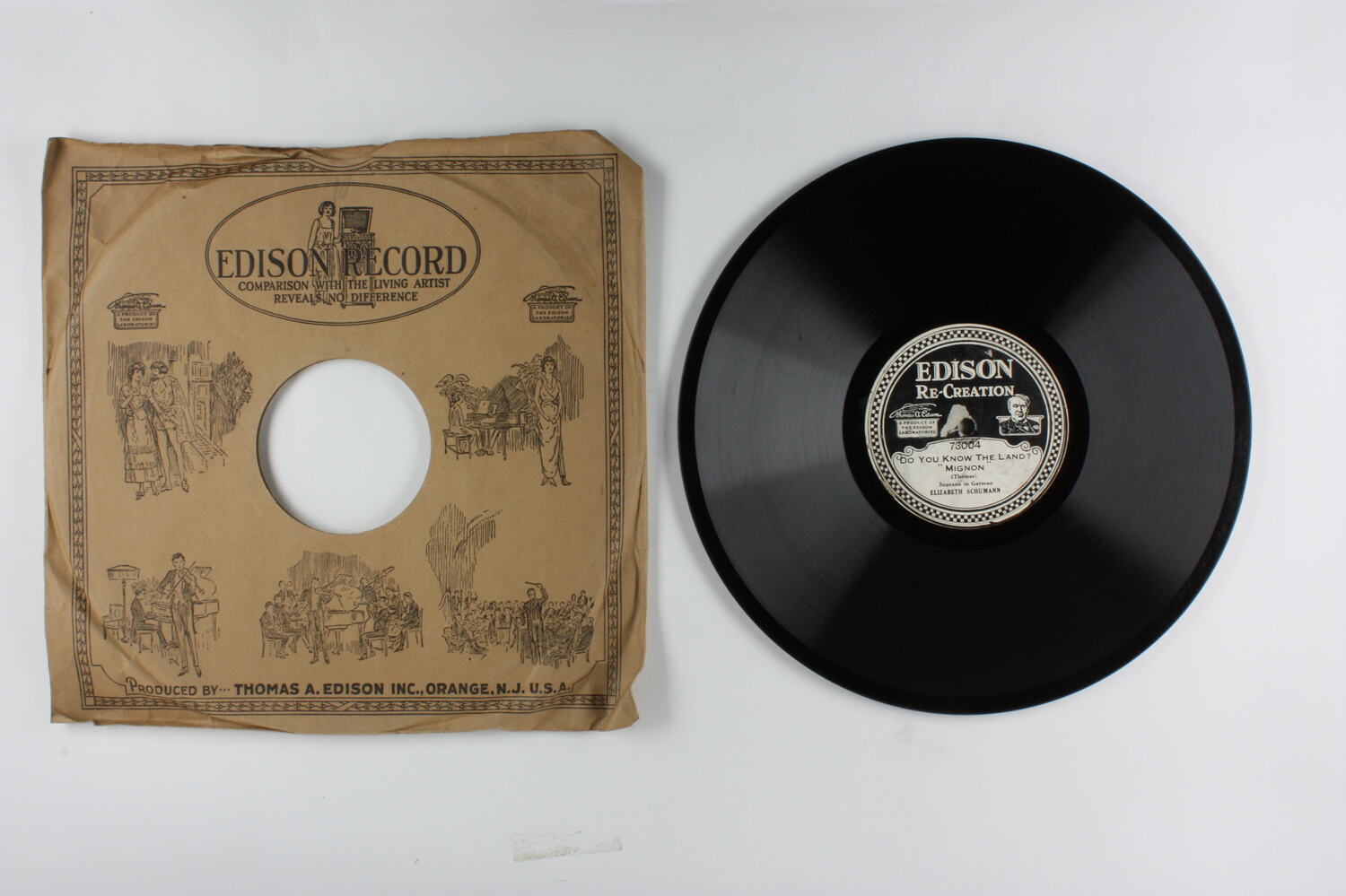 Side A: EDISON RE-CREATION / A PRODUCT OF THE EDISON LABORITORIES / 73004 / DO YOU KNOW THE LAND? "MIGNON" / (Thomas) / Soprano in German / ELIZABETH SCHUMANN Side B: EDISON RE-CREATION / A PRODUCT OF THE EDISON LABORITORIES / 73004 / I THINK OF YOU MARGUERITE / (Meyer-Helmund) / Tenor in German / KARL JORN One side of sleeve: EDISON RECORD / (text and illustrations). Second side of sleeve: (text) / (Patents - list of years latest1918) / (text)