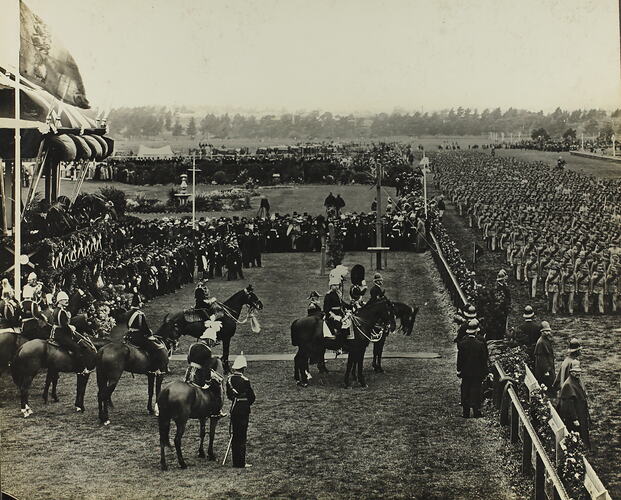 Australian Federal Parliament Opening Ceremony, 1901, Celebrations, Governments, Royal Visits, Street Decorations, Public Ceremonies, Public Events, Royal Exhibition Building: History of Events, 1900-1949, Mounted Infantry, Police, Royal Tours, Race Tracks, Racecourses, Cadets, Pavilions
