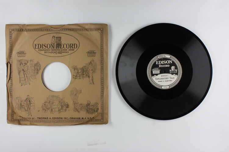 Side A: INDEX NO. 24871 V/O 39 / EDISON RECORD / A PRODUCT OF THE EDISON LABORITORIES / 83004-R / CIELO E MAR / Gioconda (Ponchielli) / Tenor Solo / In Italian / GIUSEPPE ANSELMI / 1373 Side B: EDISON RECORD / A PRODUCT OF THE EDISON LABORITORIES / 83004-L / EXPLANATORY TALK / HARRY E. HUMPHREY / 2710 One side of sleeve: EDISON RECORD / (text and illustrations) Second side of sleeve: (text) / (Patents - list of years latest1918) / (text)