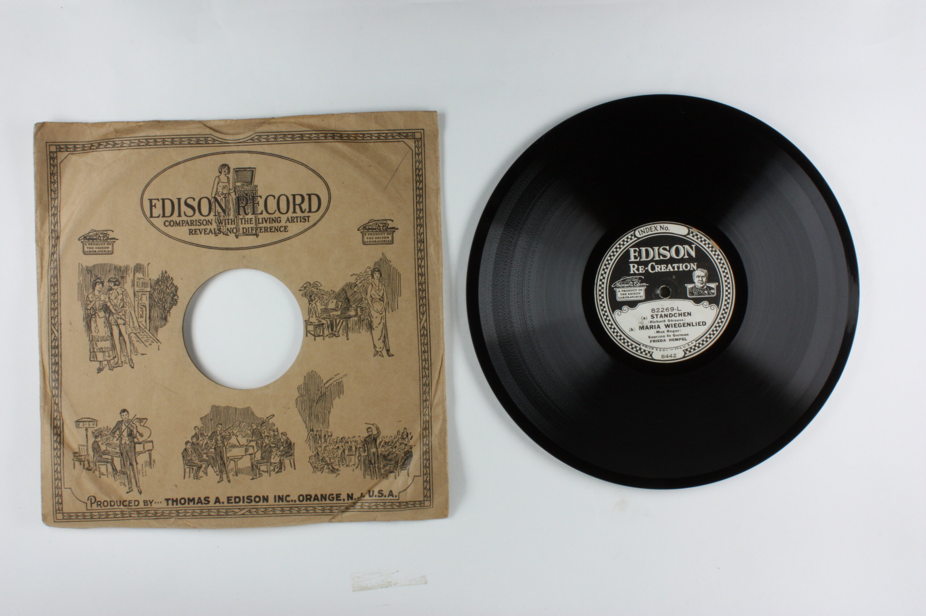 Side A: INDEX NO. 24871 V/O 40 / EDISON RE-CREATION / A PRODUCT OF THE EDISON LABORITORIES / 82269-R / ALLMÄCHT'GER VATER / Rienzi (R. Wagner) / Tenor in German / JAQUES URLUS / PRICE $2.00 in the U.S.A. / 3596 Side B: EDISON RE-CREATION / A PRODUCT OF THE EDISON LABORITORIES / 82269-L / (a) STANDCHEN / (Richard Strauss) / (b) MARIA WIEGENLIED / (Max Reger) / Soprano In German / FRIEDA HEMPEL / PRICE $2.00 in the U.S.A. / 8442 One side of sleeve: EDISON RECORD / (text and illustrations) Second side of sleeve: (text) / (Patents - list of years latest1918) / (text)