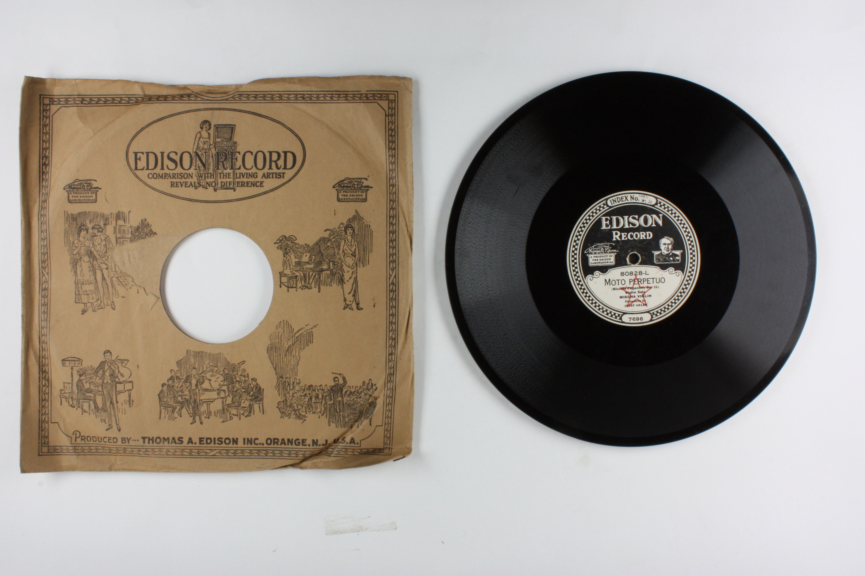 Side A: INDEX NO. 24871 1/M 29 / EDISON RECORD / A PRODUCT OF THE EDISON LABORATORIES / 80828-L / MOTO PERPETUO / (Niccolo Paganini, Op. 11) / Violin Solo / MISCHA VIOLIN / Pianoforte by / JOSEF ADLER / 7696 Side B: EDISON RECORD / A PRODUCT OF THE EDISON LABORATORIES / 80828-R / HUNGARIAN LOVE SONG / Violin Solo / HELEN WARE / Pianoforte by / FRANCIS MOORE / 4007 One side of sleeve: EDISON RECORD / (text and illustrations) Second side of sleeve: (text) / (Patents - list of years latest1918) / (text)