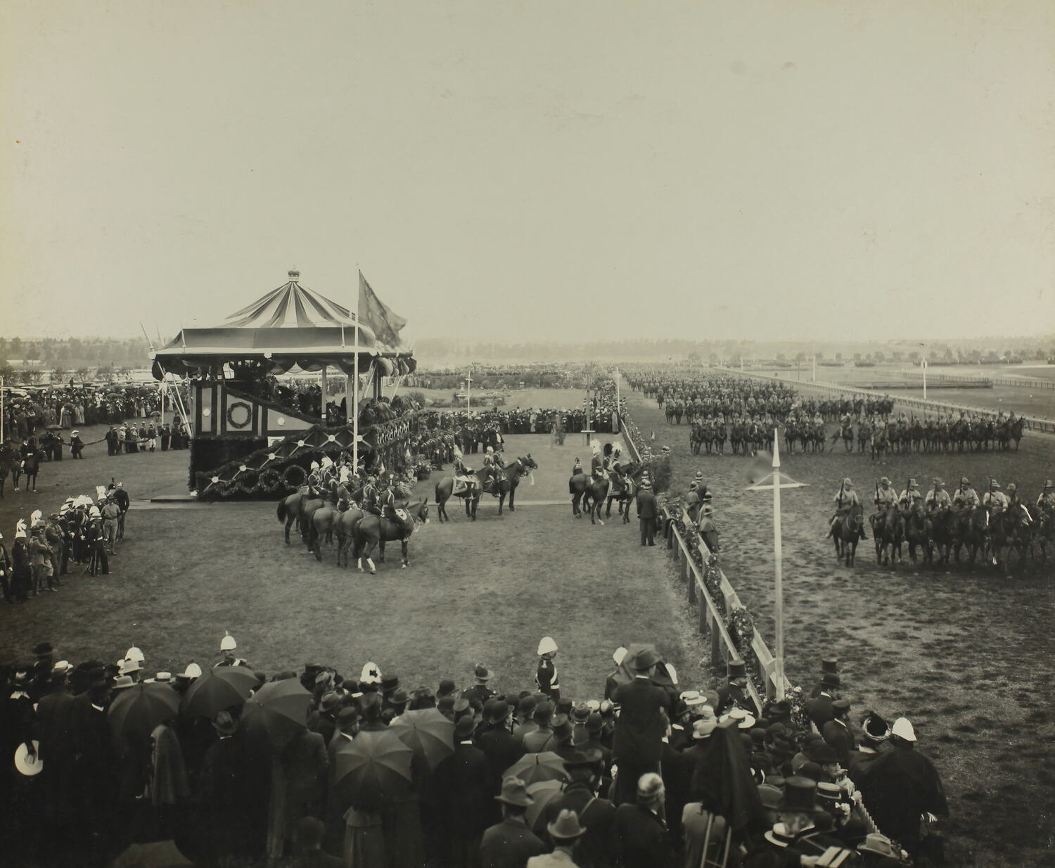 Mounted soldiers in uniform marching past the royal pavilion of the Duke and Duchess of Cornwall and York at Flemington Racecourse, Melbourne, during the Federation celebrations, May 1901, The royal party is standing in front of the pavilion alongside a group of mounted guards and police. The squadron of infantry is on parade along the track proper. In the foreground is a group of spectators, many holding umbrellas. One man is photographing the event, standing behind a hood over a view camera.