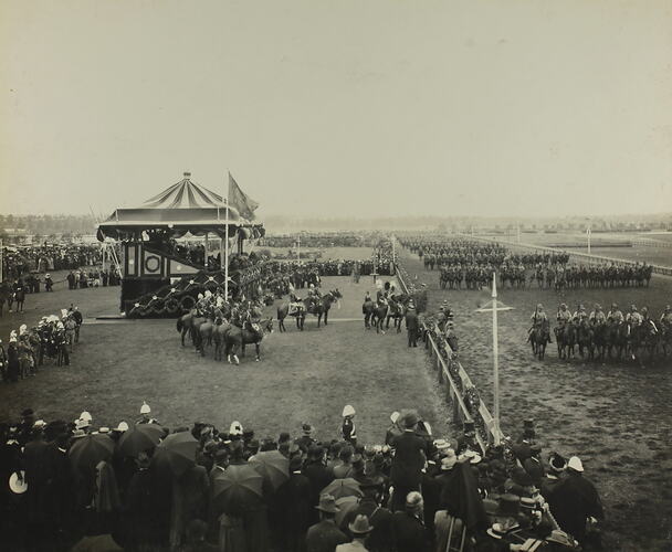 Australian Federal Parliament Opening Ceremony, 1901, Celebrations, Governments, Royal Visits, Street Decorations, Public Ceremonies, Public Events, Royal Exhibition Building: History of Events, 1900-1949, Mounted Infantry, Police, Royal Tours, Race Tracks, Racecourses, Cadets, Pavilions