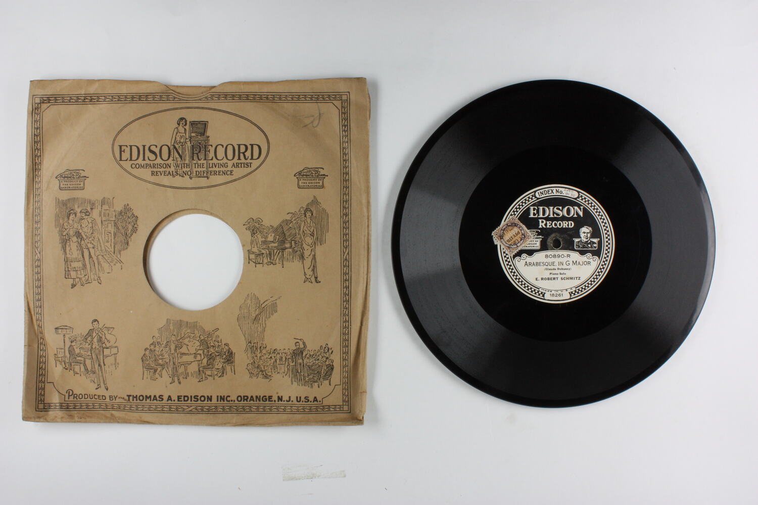 Side A: INDEX NO. 24871 1/M 35 / EDISON RECORD / A PRODUCT OF THE EDISON LABORATORIES / 80890-R / ARABESQUE, IN G MAJOR / (Claude Debussy) / Piano Solo / E. ROBERT SCHMITZ / Made in U.S.A. / 18261 Side B: EDISON RECORD / A PRODUCT OF THE EDISON LABORATORIES / 80890-L / THE LITTLE SHEPHERD AND GOLLIWOGG'S CAKE WALK / from "CHILDREN's CORNER" - Suite / (Claude Debussy) / Piano Solo / E. ROBERT SCHMITZ / Made in U.S.A. / 18262 One side of sleeve: EDISON RECORD / (text and illustrations) Second side of sleeve: (text) / (Patents - list of years latest1918) / (text)