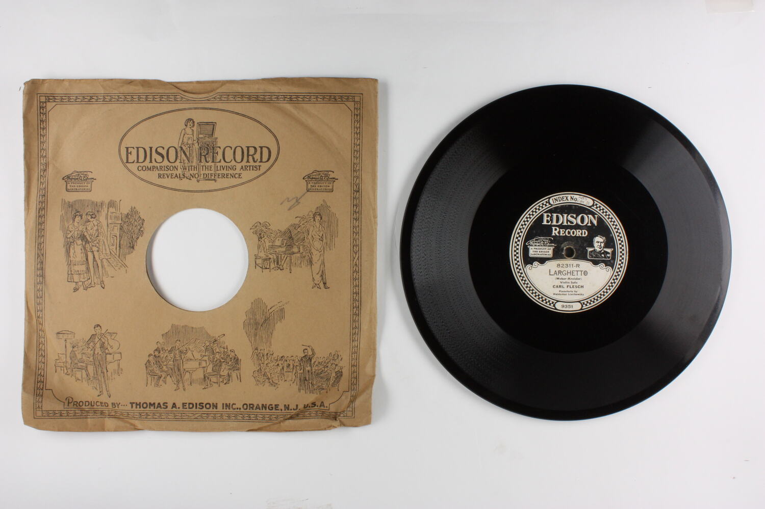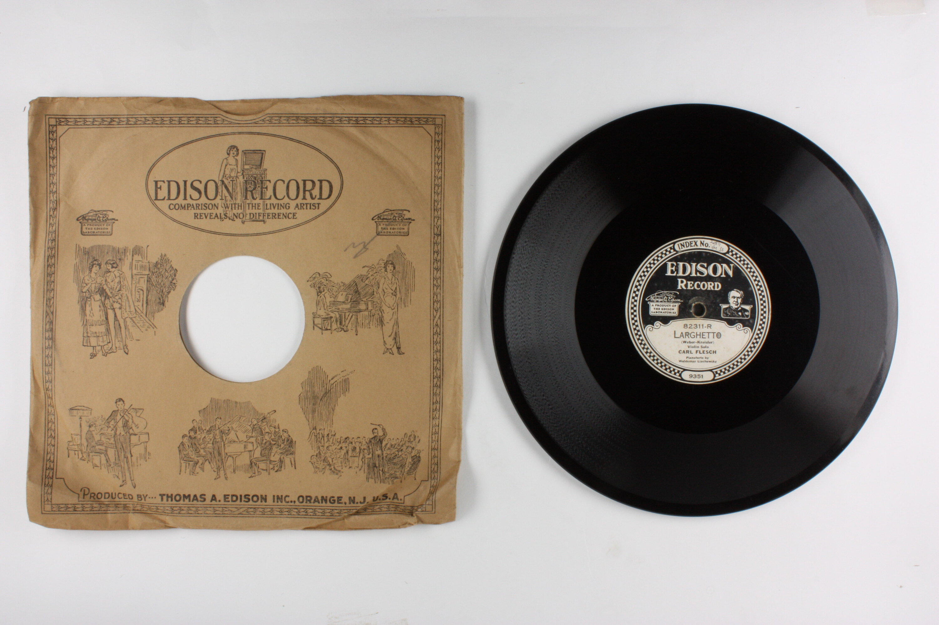 Side A: INDEX NO. 24871 1/M 33 / EDISON RECORD / A PRODUCT OF THE EDISON LABORATORIES / 82311-R / LARGHETTO / (Weber-Kreisler) / Violin Solo / CARL FLESCH / Pianoforte by / Waldemar Liachowsky / 9351 Side B: EDISON RECORD / A PRODUCT OF THE EDISON LABORATORIES / 82311-L / SLAVONIC DANCE NO. 7 / (Dvorak) / Violin Solo / CARL FLESCH / Pianoforte by / Waldemar Liachowsky / 9352 One side of sleeve: EDISON RECORD / (text and illustrations) Second side of sleeve: (text) / (Patents - list of years latest1918) / (text)
