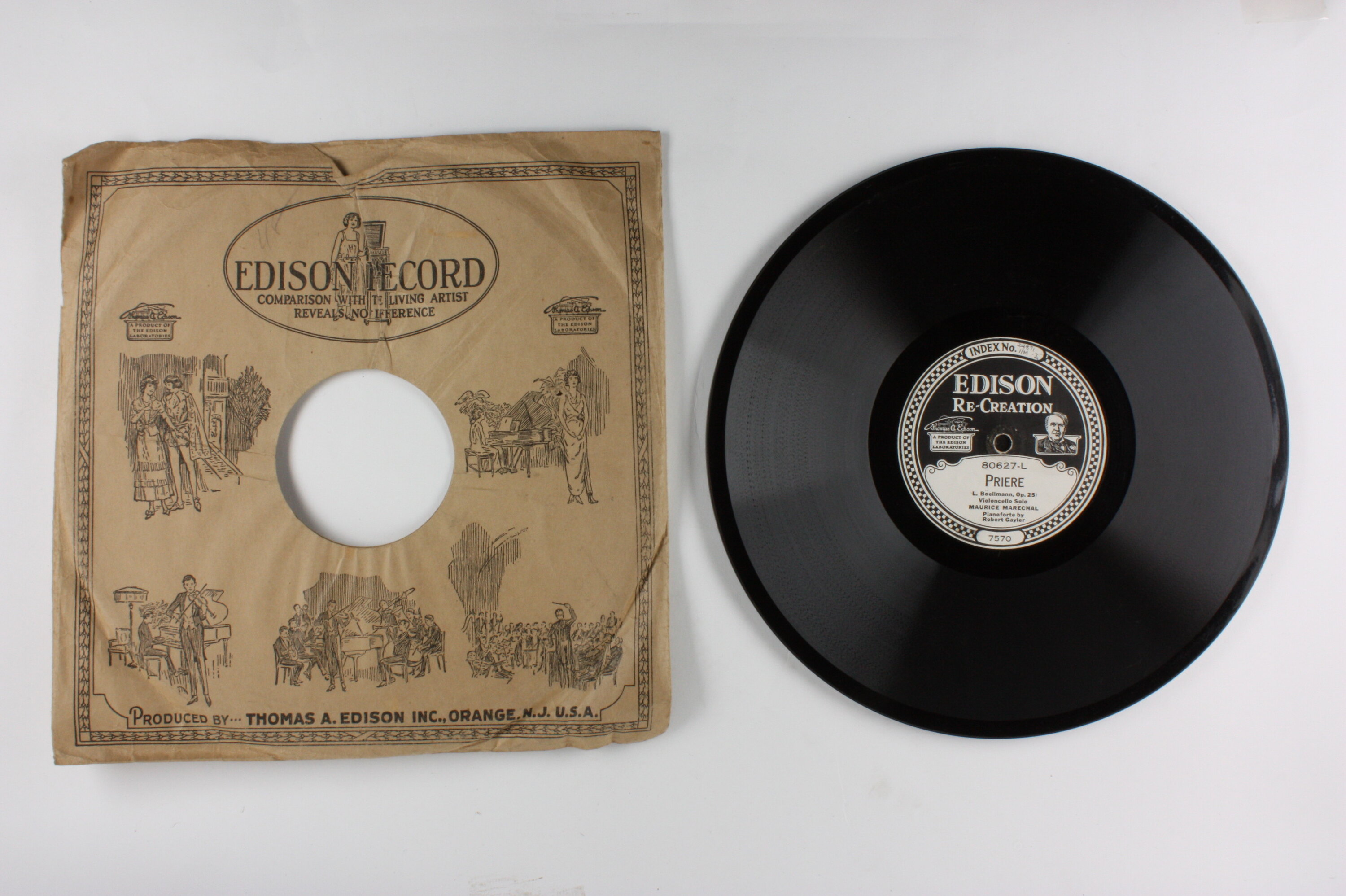 Side A: INDEX No. / EDISON Re-creation / A PRODUCT OF THE EDISON LABORATORIES / 80627-L / PRIERE / L.Boellmann, Op. 25 / Violoncello Solo / MAURICE MARECHAL / Pianoforte by / Robert Gayler / 7570 Side B: INDEX No. / EDISON Re-creation / A PRODUCT OF THE EDISON LABORATORIES / 80627-R / RONDO-SONATE IN G / (Jean Baptisee Breval) / Violoncello Solo / MAURICE MARECHAL / Pianoforte by / Robert Gayler / 7577