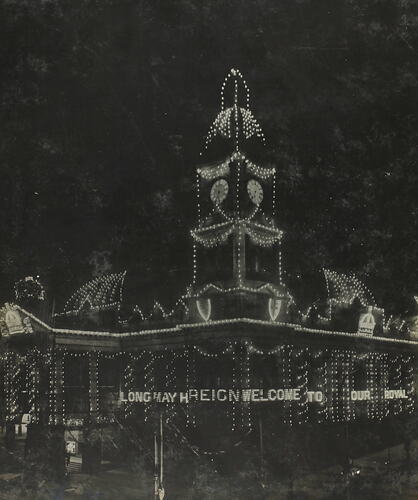 The Town Hall, Swanston Street, Melbourne, at the time of the Federation celebrations, May 1901. On the face of the building are the words, 'Long May He Reign, Welcome to Our Royal [Visitor]', in lights,