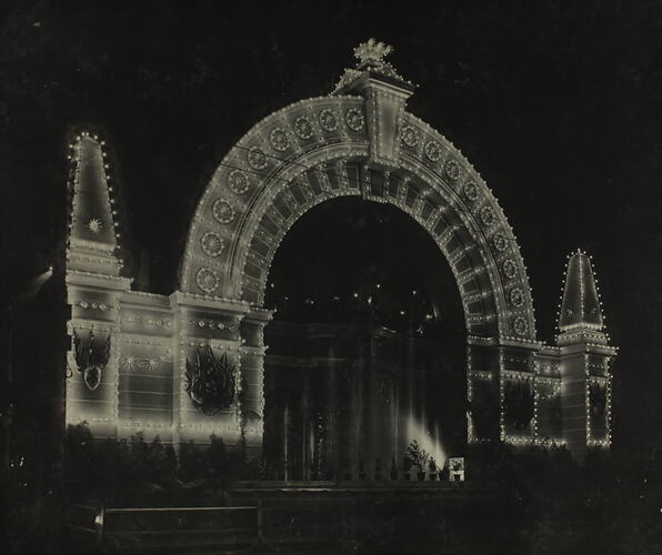 One of a set of 47 original photographs of the Australian Federation celebrations in Melbourne 1901 to mark the opening of the first Federal Parliament of Australia. The photographs trace the Royal Visit of the Duke and Duchess of Cornwall and York for the occasion, from their arrival in Melbourne on the Royal Yacht 'Ophir' at St Kilda Pier on 6 May 1901 to their departure for Brisbane at Port Melbourne Railway Station on 19 May 1901. The photographs include scenes of the Federation Arches throughout Melbourne, Illuminated City Buildings,'The Opening of Parliament', 'German, Russian, Dutch and American cruisers at Port Melbourne', 'Royal Review at Flemington Racecourse', 'Royal Yacht Ophir and British War Ships', 'The Russian Cruiser Cromoboi...' and 'State School Fetes at the Exhibition Building'.