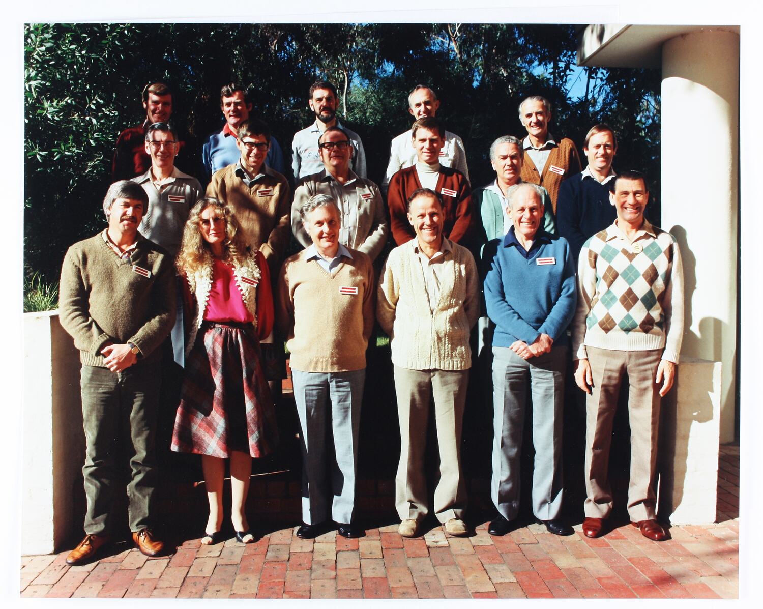 Colour photograph of attendees at a State Savings Bank of Victoria, Personnel Management course, held from 7-9 May 1984. In a group of 17 people, there is only one woman. Keith Morter, then manager of the branch at 315 Collins Street, is standing second from right in the front row. An employee of the State Bank from 1942, Keith retired the year after this photograph was taken.