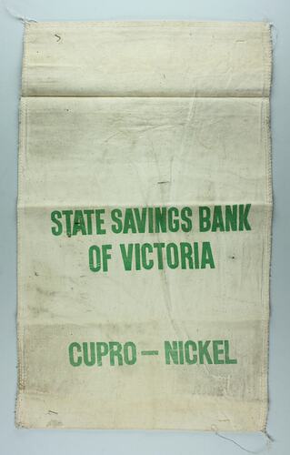 State Savings Bank of Victoria calico money bag for cupro-nickel coins (i.e. 'silver' coins made up of 75% copper, 25% nickel). Four of Australia's coins are made from cupro-nickel: the 5, 10, 20 and 50. This money bag was kept by Keith Morter, a man who spent his entire career with the SSB. When he retired in 1985, he was manager of the 315 Collins Street branch, at the time one of the largest SSB branches in the state.